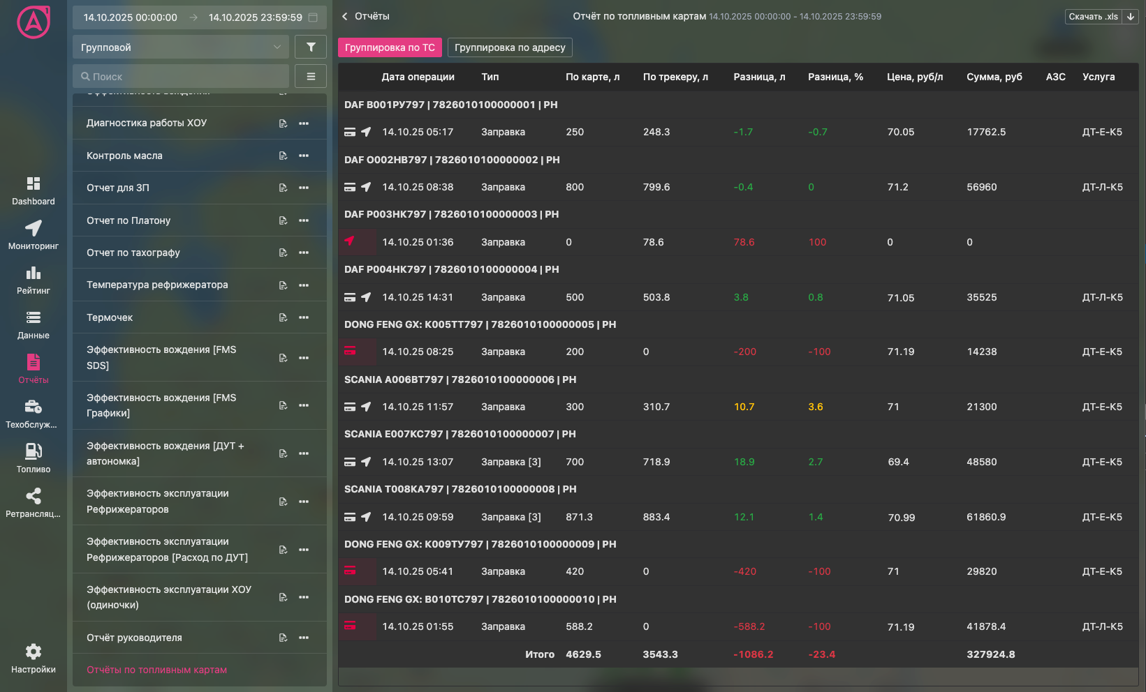 Это обеспечивает точное и прозрачное представление о движении топлива во всем автопарке. Если нужного оператора нет в списке — реализуем интеграцию в кратчайшие сроки!